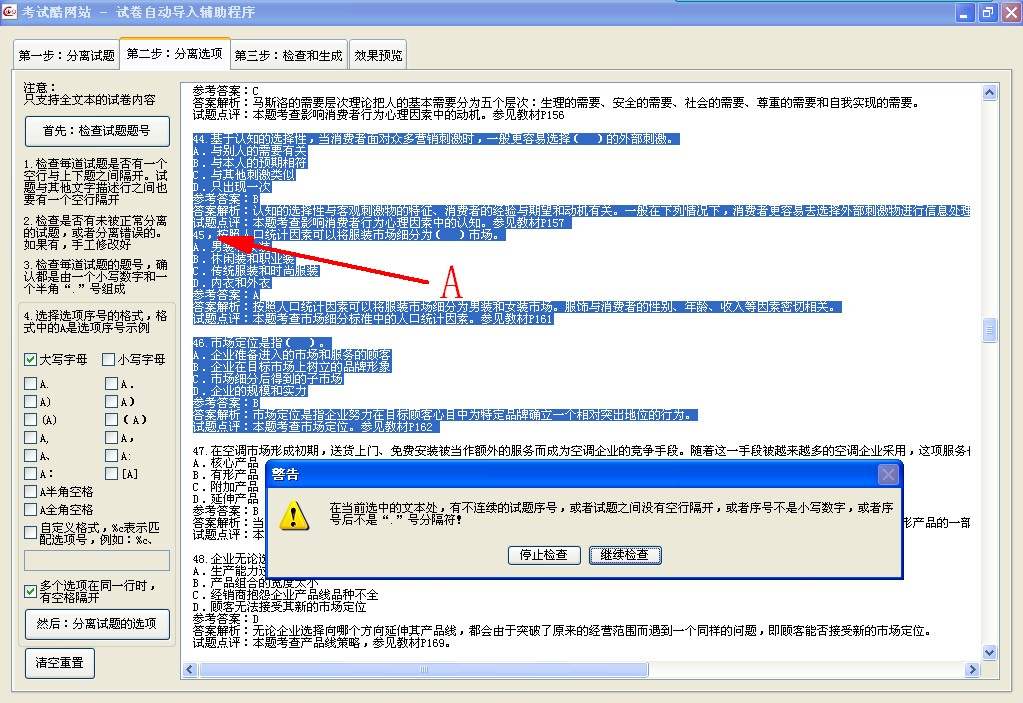 因?yàn)樵荚嚲韮?nèi)容的格式不標(biāo)準(zhǔn)、或者書寫錯(cuò)誤等各種原因,都可能使得某些試題并不能被成功地識(shí)別出來(lái),導(dǎo)致沒(méi)有被正確地分離開(kāi)。這時(shí),我們需要通過(guò)逐個(gè)試題地檢查,以便找出沒(méi)有被正確識(shí)別和分離的地方。如上圖“C”處所示,點(diǎn)擊“首先:檢查試題題號(hào)”按鈕,就可以自動(dòng)檢查沒(méi)有正確識(shí)別和分離的地方。如果確實(shí)存在沒(méi)有正確識(shí)別和分離的地方,則程序會(huì)彈出如下圖所示的提示。下圖“A”處所示,因?yàn)轭}號(hào)被書寫為“45,”,而不是“45、”,所以未能被正確地識(shí)別和分離。