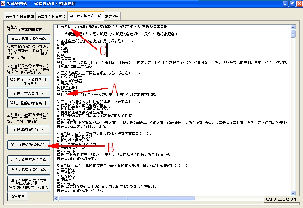 如果試卷內(nèi)容的第一行是試卷名稱的話,則可以點(diǎn)擊“第一行標(biāo)記為試卷名稱”按鈕,將第一行文字標(biāo)記為試卷名稱,如上圖中的“B”和“C”處所示。