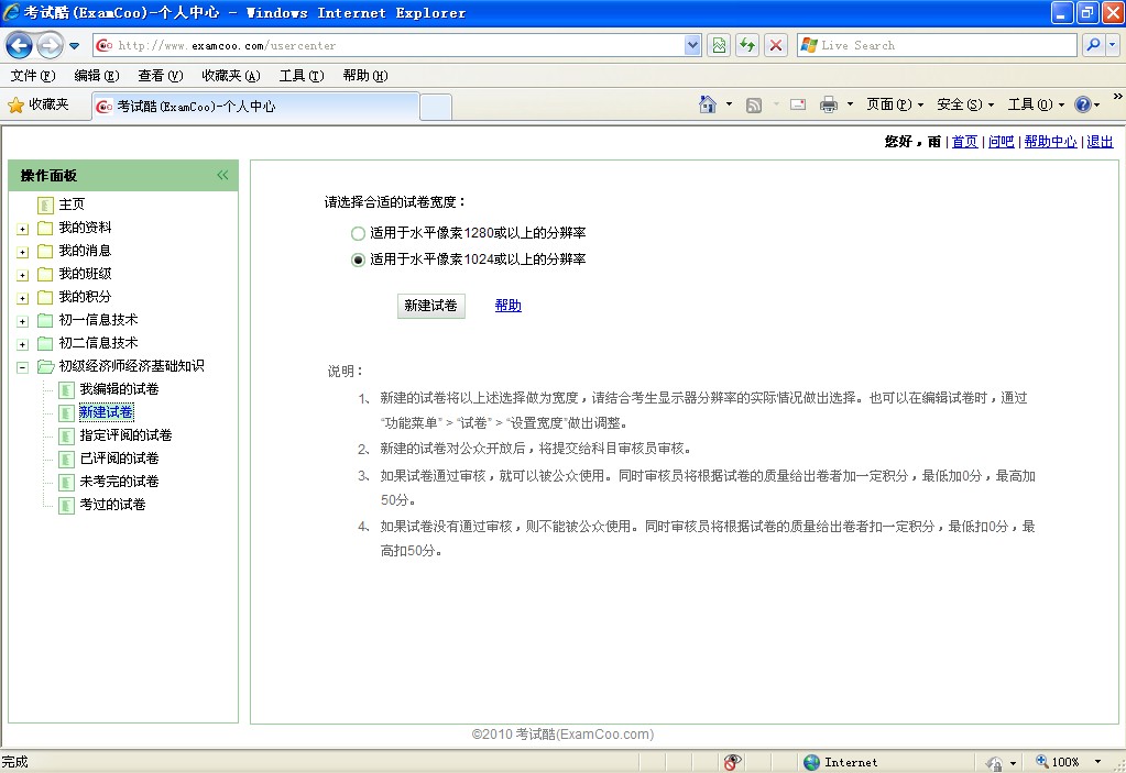 首先開(kāi)啟Internet Explorer 8(目前自動(dòng)導(dǎo)入功能只支持IE8瀏覽器),注冊(cè)和登錄考試酷網(wǎng)站(http://www.examcoo.com)、免費(fèi)和即時(shí)申請(qǐng)教師資格、設(shè)置感興趣的科目、進(jìn)入該科目里打開(kāi)“新建試卷”頁(yè)面。如下圖所示。