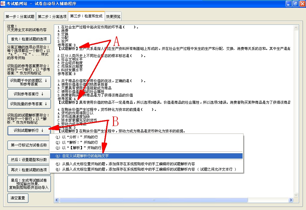 碰到這種情況時(shí),只要執(zhí)行如下圖“B”處所示的“識(shí)別試題解析行”——>“(4) 自定義試題解析行的起始文字”菜單命令,在隨即打開(kāi)的“請(qǐng)輸入要識(shí)別的試題解析行的起始文字”窗口中,輸入“【試題解析】”后開(kāi)始識(shí)別處理,所有的試題解析就會(huì)被自動(dòng)識(shí)別出來(lái),并被添加在每道試題的后面。