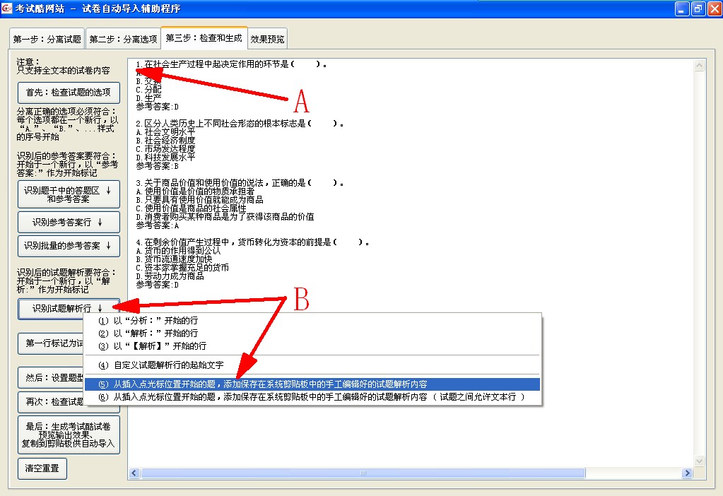 第三步就是點(diǎn)擊執(zhí)行“識(shí)別試題解析行”——>“從插入點(diǎn)光標(biāo)位置開(kāi)始的題,添加保存在系統(tǒng)剪貼板中的手工編輯好的試題解析內(nèi)容”菜單命令,如下圖“B”處所示。執(zhí)行后,所有的試題解析就會(huì)被逐個(gè)地、順序地添加到對(duì)應(yīng)的試題下面了。