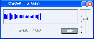 對(duì)于“多方討論”服務(wù),操作上會(huì)有稍微不同,它在教師機(jī)和學(xué)生機(jī)上打開的“網(wǎng)上語音服務(wù)”窗口,相對(duì)于其它兩種服務(wù),這里多了“MIC”按鈕,如下圖所示。因?yàn)榇嬖诙喾街v話者,所以您需要首先拿到“話筒”才能開始講話,將聲音傳送給其它人。當(dāng)沒有人講話時(shí),您可以將鼠標(biāo)移到“MIC”按鈕上,然后按下鼠標(biāo)左鍵不放,這時(shí)鼠標(biāo)形狀變?yōu)橐粋(gè)麥克風(fēng)形狀,表示您拿到了“話筒”,可以開始講話,等您說完了,只須放開鼠標(biāo)左鍵,就可以將“話筒”交到其它人手上。