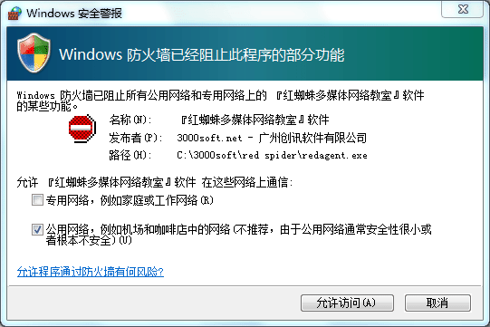 紅蜘蛛軟件安裝時,Windows防火墻可能會彈出如下的“Windows安全警報”提示窗口,如下面圖1所示。這個時候應(yīng)該首先選中“專用網(wǎng)絡(luò)”和“公用網(wǎng)絡(luò)”兩個選項,然后單擊“允許訪問”按鈕。