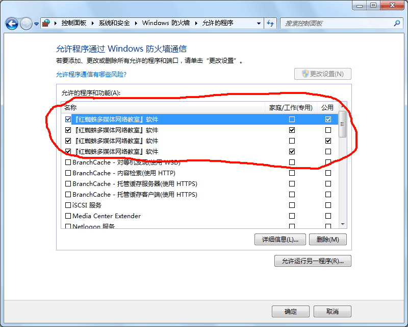 不管圖1所示的窗口有沒有彈出來讓你設(shè)置,都應(yīng)該進(jìn)入圖2所示的窗口進(jìn)行驗證,保證這2個(學(xué)生機(jī)上是1個)程序的EXE文件都已經(jīng)加入“允許的程序和功能”列表,并且是勾選狀態(tài)。如果沒有這幾項,就要手工單擊“允許運(yùn)行另一程序”按鈕正確地把它們添加進(jìn)去。如果“公用”和“專用”列不是被勾選的,也要相應(yīng)地變更過來。