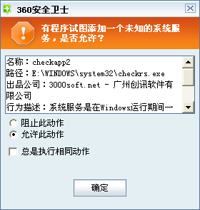 安裝紅蜘蛛軟件時,360安全衛(wèi)士會提示一個“有程序試圖添加一個未知的系統(tǒng)服務(wù),是否允許?”的消息框,如下面圖3所示。這個時候,你需要選擇“允許此動作”,同時勾選“總是執(zhí)行相同動作”,然后單擊“確定”按鈕以完成紅蜘蛛軟件的正確安裝。