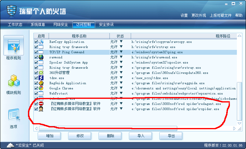 響應(yīng)上述設(shè)置后,可以在瑞星個人防火墻軟件的“訪問控制”->“程序規(guī)則”窗口上見到如下面圖5所示的2個(學(xué)生機(jī)上是1個)設(shè)置項,其狀態(tài)都是“允許”。