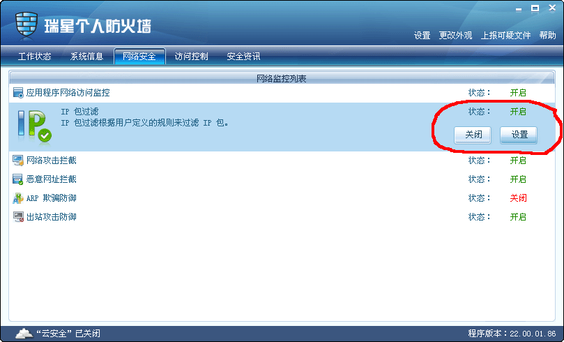 2. 工作在“高”安全級別的瑞星個人防火墻,其IP包過濾機(jī)制還會阻止網(wǎng)絡(luò)中UDP廣播數(shù)據(jù)包的接收。如下面圖6所示,如果“網(wǎng)絡(luò)安全”中的“IP包過濾”機(jī)制處于“開啟”狀態(tài),則需要單擊“設(shè)置”按鈕進(jìn)行“端口開關(guān)”的設(shè)置,如下面圖7所示。
