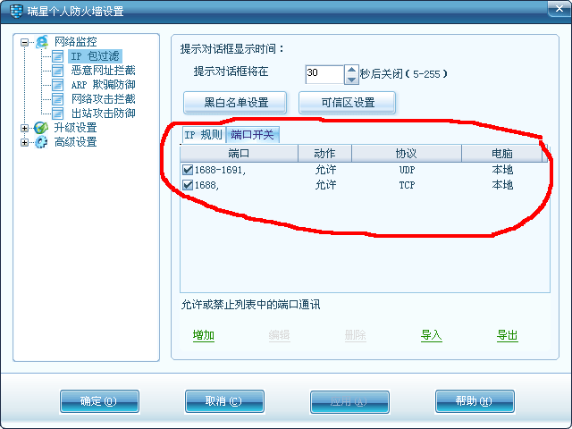 默認(rèn)的情況下,紅蜘蛛軟件運(yùn)行在第1頻道上,這個時候它采用的IP協(xié)議端口值分別是TCP1688、UDP1688~1691。在瑞星個人防火墻的“網(wǎng)絡(luò)監(jiān)控”->“IP包過濾”->“端口開關(guān)”頁面上,你需要把這些端口值都“增加”到里面,全部設(shè)置為“允許”的動作。具體的可以參考下面圖7上的圖示。
