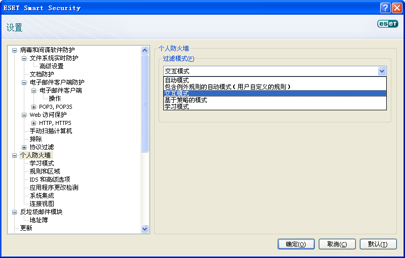 如果你安裝的是ESET NOD32的個人防火墻(ESET安全套裝的一部分),則首先要確保其“過濾模式”是可以支持傳出傳入連接的。