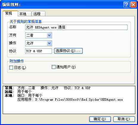 需要注意的是,在新建或者編輯這些規(guī)則的時候,方向要選擇“二者”,操作要選擇“允許”,而協(xié)議則要選擇“TCP & UDP”,如下面圖15所示。應(yīng)用程序文件名則通過“本地”頁面上的“瀏覽”按鈕去選擇,如下面圖14所示。