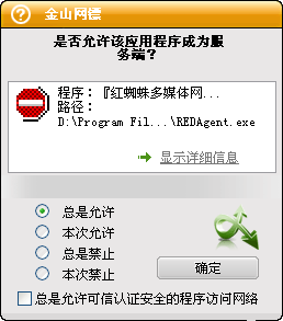 紅蜘蛛軟件安裝時,金山網(wǎng)鏢可能會彈出如下面圖19和圖20所示的提示窗口,這個時候要在窗口上選擇“總是允許”選項,再單擊“確定”按鈕才行。